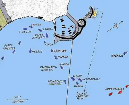 One sloop had been fitted out as an explosion vessel, with 143 barrels of gunpowder aboard, and Milne asked at 20:00 that it be used against the "Lighthouse battery", which was mauling his ship. The vessel was exploded, but to little effect and against the wrong battery.[17]
