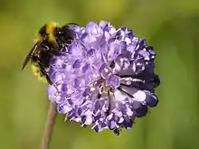 Both sexes visit green alkanet, devil's-bit scabious, and thistle flowers. The queen also flies to dandelion, red clover, germander speedwell, and ground ivy, while the male feeds on bramble and knapweed.[4]