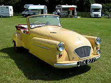 In December 1949, a Deluxe version was added to the range. This has a Villiers 6E 197 cc (12 cu in) engine, which had an increased output to 8 bhp (6 kW; 8 PS) and a power-to-weight ratio of 51 bhp (38 kW; 52 PS) per ton.[31] There were also a number of modest refinements including a spare wheel and a single wing mirror.[14] The manually operated windscreen wiper fitted on the standard car was upgraded to an electric Lucas type. Although this was found to damage the original perspex windscreen,[30] it was not replaced by a Triplex Safety Glass screen until the introduction of the Mark B in 1951.[14][32]