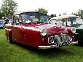 By the time of the Earl's Court Cycle and Motor Cycle Show in November 1951, three pre-production Mark C's were on show.[43] On these the front wings had become longer and less triangular in profile than the ESC, the grille was also lower and more rounded and the front valance was now a more defined bumper shape.[44] The new Minicar design was very well received,[45] and was due to go on sale in early 1952.[46] By July however, "owing to supply difficulties" it was still unavailable,[47] and the earliest production cars were not recorded as being built until October 1952.[48] Four of the cars were on display at that year's show along with a Sharp's Minivan.[49]