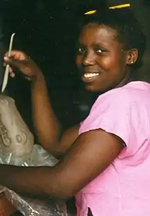 At Ardmore, Bonnie Ntshalintshali was at first an apprentice, but in time she and Halsted ran the studio more as partners. In 1988 Ntshalintshali won the Corobrik National Ceramics Award. She and Halsted were jointly named winners of a Standard Bank Young Artist Award in 1990. In 1991, she was invited to design fabric prints based on her ceramics for a festival in Grahamstown. Her ceramics were featured at the Seville Expo in 1992, at the Venice Biennale in 1993, and at the South African Bienniale in 1995. Ntashalintashali's designs often drew from Zulu folk culture or Biblical motifs.[4] Her sister-in-law Beauty Ntshalintshali, her half-brother Vuzi Ntshalintshali, and another relative, Somandla Ntshalintshali, all joined her at Ardmore and also learned the shop's distinctive style.[5][6]