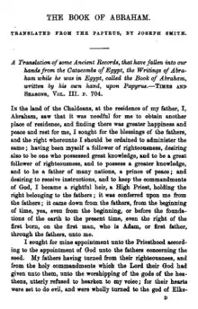The Book of Abraham is a work produced between 1835 and 1842 by Joseph Smith[1] following the purchase of two Egyptian scrolls from a traveling mummy exhibition. According to Smith, the book was "a translation of some ancient records... purporting to be the writings of Abraham, while he was in Egypt, called the Book of Abraham, written by his own hand, upon papyrus".[2] Smith said the papyri described Abraham's early life, his travels to Canaan and Egypt, and his vision of the cosmos and its creation.