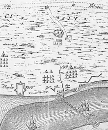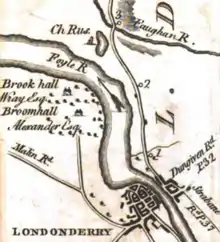 In 1688, during the Williamite War in Ireland, Charles Fort was occupied by Jacobite forces as part of the Siege of Derry. To try to prevent Williamite forces from relieving the siege a boom was constructed across the River Foyle to prevent the passage of ships.[4] The boom extended from Fort Charles to a new fort constructed on the opposite bank and the Boom Hall estate housed some of the Jacobite forces.[4][3] A Williamite force successfully breached the boom in 1689 and relieved the defenders of Derry.[3]