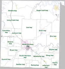 Former townships include Bear Creek, Crooked Creek, Elmwood, Harrison, Washington, and Young.