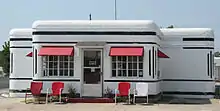 A 1970s' gabled roof installed during the Asplin era was restored to the original flat roof in April 2013,[30][31][32] a prerequisite for listing the streamline moderne property on the US National Register of Historic Places.[33][34] The $12,000 federal matching grant from the National Park Service Route 66 Corridor Preservation Program required the owners raise a matching $12,000 sum[35][36] — a task which was assisted by donations and a preservation award from the Route 66 Association of Missouri.[37] An additional matching grant funded the 2016 restoration of the building's architectural neon.[38][39][40][41]