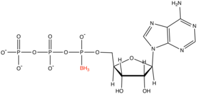 Structure of a boranophosphate analogue of ATP, the borane substituent is highlighted in red.[1]