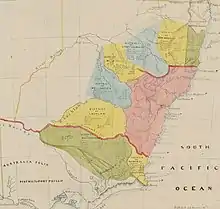 This district came into existence in 1842 and consisted of the coastal region around the Clarence River and the Richmond River. The first Commissioner of Crown Lands and head of Border Police for this region was Oliver Fry and his headquarters were at Red Rock near to the junction of the Orara River and Clarence River. He was previously assistant commissioner for the Liverpool Plains district and was considered suited to the profession after capturing and killing members of the Scotchie bushranging gang while working as a sheep station manager near Crookwell.[109] Fry and his troopers were active in the Richmond River area, apprehending Aboriginal people for stealing sheep.[110] By 1845, eight people had been murdered by Aboriginal people and during a rencontre, a member of the Border Police was nearly killed.[111] Also in that year, Fry and his troopers shot 16 Aboriginal people along the Boyd River as summary punishment for the spearing death of a shepherd at Newton Boyd.[112] In 1846, Fry's force teamed up with Robert Massie's Border Police on the Macleay River in an attempt to capture a well-known bushranger named Wilson.[113] They failed in their quest and Wilson was shot a few months later by troopers of the New South Wales Mounted Police.[114] Battles with local Aboriginal people seemed to have tapered off around this time, with Fry ceding some time to arresting shepherds for attempting to rape young girls and setting dogs onto local native people.[113] By 1848, the Border Police had largely been disbanded in the Clarence District, but Fry still had at least one trooper working for him while investigating the mass poisoning deaths of 23 Aboriginal people at Kangaroo Creek in 1847. The owner of this run, Thomas Coutts, was arrested by Fry for this mass-murder and a previous incident where he shot at least one Aboriginal. Coutts was sent to Sydney for trial but the case was dropped after he was bailed for a large amount of money.[115] Oliver Fry's involvement in the European colonisation of the region is recognised in the naming of Oliver Street and Fry Street in Grafton.
