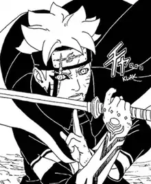 In the first few pages of the first chapter Boruto: Naruto Next Generations, an encounter between an older teenage Boruto against another one named Kawaki was briefly shown as a flashforward.[13] The purpose was to attract more fans so they could look forward to the battle as it has a chaotic state to it.[3] The battle against Kawaki was shown instead in the first chapter rather than Sasuke's one against Kinshiki Otsutsuki from the Boruto film to generate a different impact within the fans despite sharing the same storyline. Boruto's teenage design was first illustrated in little time. As a result, Mikio Ikemoto stated that once Boruto reached this moment, the older protagonist's design might change.[10] As the story in the manga progresses, Boruto's facial expressions change when interacting with other character; with the friendly Tento, Boruto's eyes are shown bigger due to the portrayal of Boruto's childish personality. However, upon meeting Kawaki, Boruto's eyes are illustrated smaller due to the author's intent to show a more rebellious take on Boruto.[8]