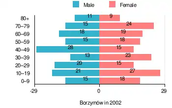 According to the 2002 Poland census, there were 325 people residing in Borzymów village, of whom 48.3% were male and 51.7% were female. In the village, the population was spread out, with 21.5% under the age of 18, 32% from 18 to 44, 18.8% from 45 to 64, and 27.4% who were 65 years of age or older.[1]