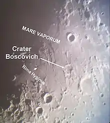 Boscovich is a lunar impact crater that has been almost completely eroded away by subsequent impacts. It is located west-northwest of the crater Julius Caesar, and south-southeast of the prominent Manilius. The crater floor has a low albedo, and the dark hue makes it relatively easy to recognize. The surface is crossed by the rille system designated Rimae Boscovich that extends for a diameter of 40 kilometres. The crater is named after Croatian physicist Roger Joseph Boscovich.[1]