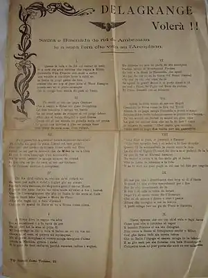 The oldest known bosinade date back to the early 18th century, but scholars (for example C. Repossi[4]) tend to believe that the tradition might have begun much earlier, possibly in the 16th century. Only from the 18th century, in fact, bosinate were printed, which makes it possible to determine their age through an analysis of their typographical characteristics.[4] Some of the earliest printed bosinate were composed by Gaspare Fumagalli around 1723. Collections of early bosinate were edited, among others, by Francesco Cherubini[5] and Ferdinando Fontana.[6]