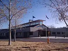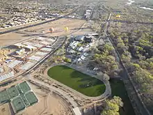 ![]() An aerial view of the school. Pictured also is a partial view of the proximate riparian forest or "bosque". | |
