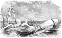 "The present whale, now an active swimming resident of our city, was caught in the St. Lawrence River, Upper Canada, between the Orelle and DuLoup rivers. His capture was secured by weirs, a sort of trap made of wooden stakes, inclosing an area of several miles of water, but so shaped as to concenter to a point where big fish are nabbed. ... Having been secured he was placed in a huge box for transportation. Before this was accomplished however, the whale gave its captors very much trouble by his powerful flappings, jumpings &c. &c., having floundered some Frenchmen several times, much to their peril and inconvenience. The box was lined with sea-weed, and was partially covered at the top with slats. The precious freight was then carried 7 miles over one of the roughest roads in Canada, and from thence by rail 500 miles to Boston, by special trains. ... At each station the monster was well watered, as if he had been a locomotive. The aqueous attentions were quite necessary during the journey of 60 hours. All along the route the distinguished traveller was the object of great curiosity, and the most animated conversation. On being placed in the huge tank at the Aquarial Gardens, the process of which was witnessed by hundreds with the most intense interest, the whale at once swam in the most lively and graceful manner!"[5]