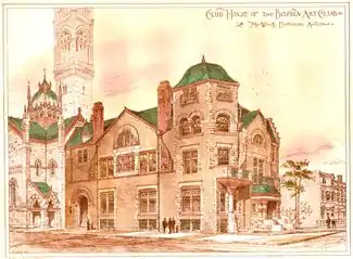 According to art historian Nancy Jarzombek, "Charles Callahan Perkins met with an old friend, amateur painter and music publisher George D. Russell, to discuss reviving the Boston Art Club. With Perkins at the helm they called a general meeting, and the suddenly revived club opened its membership to upper-class men who professed an interest in art (it remained firmly closed to women for the next six decades). The Club engaged a bow-front brick townhouse on Boylston Street for its quarters. In 1871, Perkins, Russell and Horace H. Moses, none of them professional artists, signed the petition to incorporate the Art Club and Perkins was elected President. The Club added a spacious picture gallery behind the building and in 1873 opened its first annual exhibition. From an informal artists' supper club, Perkins created a refined gentlemen's club with dining and reading rooms, an extensive library, paintings collection and a picture gallery. It hosted two juried exhibitions annually and had a large general membership. The Club also hosted informal gatherings for its members on the first Saturday of each month. Artists would bring in prints or watercolors to critique."[1]