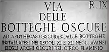 Botteghe Oscure was established in 1948.[1][2] The magazine was named after via delle Botteghe Oscure (Latin: Ad Apothecas Obscuras), where the editorial office was located;[1] during the Middle Ages the street's "dark shops" came to be installed under the dark arches of the Circus Flaminius (illustration of a street sign).