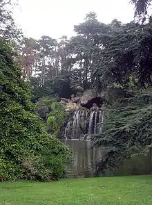 The building of the park was an enormous engineering project which lasted for five years. The upper and lower lakes were dug, and the earth piled into islands and hills. Rocks were brought from Fontainbleau and combined with concrete to make the cascade and an artificial grotto.