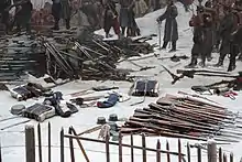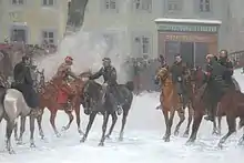The focus of the painting is upon the meeting of French General Justin Clinchant (to whom Bourbaki had given command of the Armée de l'Est) and the Swiss General Hans Herzog in front of the Hôtel Fédéral.[1] The rest of the scene shows a line of weary and wounded French soldiers trekking through a snow-covered valley to pile their arms under the supervision of the Swiss Bernese Battalion.[4][1] Some of the Frenchmen are being assisted by local residents and members of the Red Cross.[4] Rail lines and straight roads provide axes of perspective.[1] The circumference of the finished work, rendered in oil paint on canvas, is 115 metres (377 ft).[1] The panorama is unusual in depicting the tragic consequences of war, rather than the usual celebration of victory; it is also a celebration of Swiss neutrality and hospitality.[1]