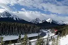 The Bow River is a river in Alberta, Canada. It begins within the Canadian Rocky Mountains and winds through the Alberta foothills onto the prairies, where it meets the Oldman River, the two then forming the South Saskatchewan River. These waters ultimately flow through the Nelson River into Hudson Bay.[1] The Bow River runs through the city of Calgary, taking in the Elbow River at the historic site of Fort Calgary near downtown. The Bow River pathway, developed along the river's banks, is considered a part of Calgary's self-image.[2]: 41–2