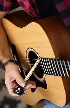 Bowed guitar is a method of playing a guitar, acoustic or electric, in which the guitarist uses a bow, rather than the more common plectrum, to vibrate the instruments' strings, similar to playing a viola da gamba. Unlike traditionally bowed instruments such as violins, the guitar generally has a relatively flat bridge radius and closely positioned strings, making it difficult to bow individual notes on the middle strings. The technique is often associated with Jimmy Page of Led Zeppelin and the Yardbirds, as well as Jónsi of Sigur Rós. Eddie Phillips of the British group the Creation was one of the first rock guitarists to use a bow in their 1966 song "Making Time".