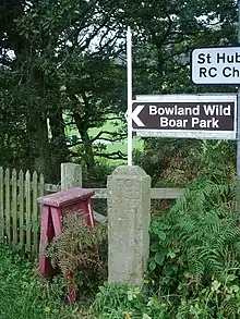 The Bowland Forest High milestone is an historic milestone marker in the English parish of Bowland Forest High, in the Trough of Bowland, Lancashire. A Grade II listed structure, erected in 1739, the milestone is in sandstone and has a rectangular plan and a shaped top. It is inscribed with the distances in miles, on one face to Lancaster and to Clitheroe (both in archaic spelling), and on the other face to Slaidburn and to Hornby.[1]