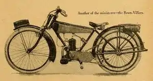 - Branded as the Bown Villiers, extant versions of a Villiers 269cc touring model still survive[12] The machine was equipped with a two-speed gearbox, drip-feed lubrication and a Bosch magneto. It had aluminium footboards, Saxon forks and Miller lighting set. The exhaust included an aluminium damper box.