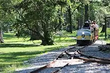 A ridable miniature railway operates seasonally in the park.[2] The line opened in the early 1950s, but shut down in 2013 as a result of heavy damage from flooding. The track was subsequently repaired, and a new train set was acquired, and operation restarted in July 2016.[2]