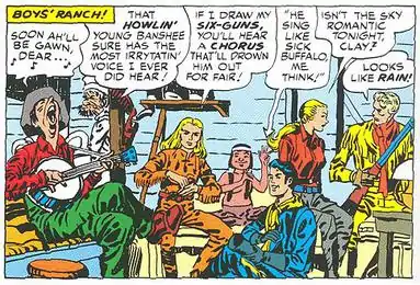Palomino Sue hails from Abilene, Texas. Her father was a wagon master. She arrived at Boys' Ranch after a trip on the wagon her father was driving was intercepted by Indians. She was the only survivor. When expressing a desire to get involved in fighting, Clay Duncan insists that, because it's too dangerous for a woman, she must remain at the ranch. She agrees, but her acquiescence was a pretence, as she later joins the fray, offering opportune assistance.[27] Similar scenes recur in her two subsequent appearances in issues #5 and 6.