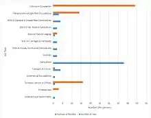 A bar graph can be seen on this page depicting the comparison between male and Female occupation statistics for Boyton in the year of 1881. One of the most recognisable features of the graph is the high proportion of females (44 specifically[10]) that come under the 'unknown occupation' section. Reason for this may be that during the Victorian Era "women’s work was not always accurately recorded within sources that historians rely on, due to much of women's work having been irregular, home-based or within a family-run business.[11]". One other noticeable aspect of the occupational structure of Boyton in 1881 is the large proportion of males who worked in the agriculture sector, of the 61 males accounted for in the 1881 occupation Census for Boyton, 38 worked in agriculture.[10] This may have been an issue for the Parish of Boyton in the late 19th century due to the occurrence of the agricultural depression[12] (most probably linked to what is known as the long depression), with such a large proportion of Boyton's male population relying on agriculture, the "series of wet summers, culminating in the wettest season in living memory in 1879 meant an alarmingly low yield in successive harvests[12]". This downfall in crop yields and the resulting collapse in the agriculture sector may be accountable for the fall in Boyton's population towards the end of the 19th century (as visible in the population graph seen on the right hand side of this page).