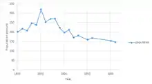 The graph to the left shows the population of the parish of Boyton from its first population recording in 1801 through to census data from 2011. Boyton's population was first recorded as a total of 201 in 1801;[13] since then the highest population level the parish has reached was that of 1851 when it was recorded that 320 people lived in the village.[13] In comparison, Boyton's population was at its lowest recorded level in 2011 with a total of 147 inhabitants.[1] The reason for this may be the decrease in size of the agricultural sector; throughout the 19th century, Boyton had a flourishing agricultural industry, with large local farms such as Boyton farm and Dock farm, and because "during the 19th century working-class children were often employed in factories and on farms" [14] the population may have risen due to people requiring children to work the lands. However recent recordings of Boyton's population show the change the parish has undergone, with the lowest population recording in 2011 (and 112 of the 147 residents of Boyton were aged 45 or over). 35.3% of the residents are retired, with only 21% in full-time employment, with as many people working in Public administration and defence as in Agriculture, forestry and fishing.[1] This modernization of the job sectors has possibly meant that a large proportion of the young population has migrated to more prosperous areas with greater opportunities for employment, such as the opportunities presented in central London.