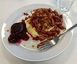 Brændende kærlighed (English: Burning love) is a traditional Danish dish[1] consisting of mashed potatoes topped with bacon and onions, both fried.[2][3][4] The mashed potatoes might also be topped with parsley,[3] leek, or grated nutmeg.[4]