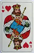 Brús is described as an old Icelandic game, but its rules and terminology suggest that it is descended from the centuries-old German game of Brusbart, now known as Bruus, which was once the national game of Hamburg and which spread across most of northern Europe spawning a family of games such as Russian Bruzbart, Polish Drużbart, Swedish Bräus, Greenlandic Voormsi and others. Brusbart in turn is descended from Karnöffel, the oldest card game in Europe with a continuous tradition of play down to the present day, a fact testified to by "the wildly disturbed ranking order in the chosen suit and particularly by the special role of the chosen Seven".[1][2][lower-alpha 1]