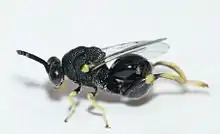 Brachymeria is a genus of parasitic wasps in the family Chalcididae. Over 300 species are known worldwide, all of them parasites of insect pupae.[1] Most species are black with limited yellow markings, and like most chalcidid wasps, they have enlarged hind femora. The female typically lays eggs inside the pupae of a lepidopteran using its ovipositor. Although mostly parasitic on Lepidoptera, a few are hyperparasites (parasites of parasitic Hymenoptera and Diptera), or attack other types of insect larvae (such as Polistes erythrocephalus).[2] The adult parasites emerge typically from the host pupa. Some species have been used in biological control.