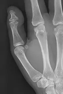 | Brachyphalangy of the thumb's distal phalanx, also known as brachydactyly type D, with otherwise normal phalanges of the 2nd-5th digits | |