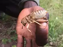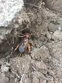 The crickets live almost entirely underground, each in its own burrow. Mating takes place in the male's burrow and the female may remain there till the eggs are laid, in a walled-off side tunnel.[4] In Zimbabwe, breeding takes place in February and March. The female lays around two hundred eggs which hatch about a month later. The nymphs crawl out of the burrow and disperse, each digging a burrow of its own. At first the nymphs grow rapidly but growth slows during the dry season from June to October. When succulent young plant material becomes available in November, growth rates speed up, with adults emerging from December onwards. There is just one generation each year.[3]