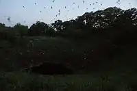 Bracken Cave is the summer home to the largest colony of bats in the world. An estimated 20 million Mexican free-tailed bats roost in the cave from March to October making it the largest known concentration of mammals.[1] The cave is located in southern Comal County, Texas, outside the city of San Antonio. The 100-foot (30 m)-wide crescent shaped opening to the cave lies at the bottom of a sinkhole, formed when the roof of the cave collapsed.