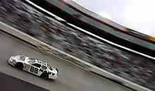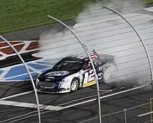 Keselowski pulled off a massive upset and earned his first career Sprint Cup victory in the Aaron's 499 at Talladega. He pushed Carl Edwards towards the front from fifth with two laps to go. Coming out of turn four on the final lap, he attempted to trick Edwards into blocking on the high side so that he could pull underneath. Edwards moved high to block, opening the door for Keselowski to attempt a pass on the low side. When he saw Keselowski moving low, Edwards again tried to block him. Their cars made contact, with Edwards spinning as Keselowski charged to the checkered flag. Due to the rear-wing design on 2009 Car of Tomorrow, Edwards' car lifted off of the ground as it spun backward.[8] After Ryan Newman's No. 39 hit Edwards' car, it sailed into the catch fence separating the track from the front grandstands, then skidded to a halt in the middle of the track. Eight fans were injured by flying debris; the most serious one being a woman who broke her jaw and was taken by helicopter to a nearby hospital. Keselowski earned his first career victory on his fifth career start and earned James Finch his first career victory as an owner in his twentieth year of racing. The race's final lap was the first Sprint Cup lap that Keselowski ever led, and therefore the only lap he led for the entire race; this was the first time in history that the very first lap a Sprint Cup driver led was the final lap of a race.[9]