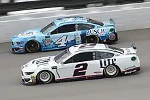 Keselowski crashed out of the 2017 Daytona 500 after leading 13 laps during the race.[54] At Atlanta, Keselowski suffered from various pit issues, including being forced to pit for a flat tire and loose lug nuts, as the race was dominated by the Ford of Kevin Harvick. On the final restart with eleven laps to go, Harvick was issued a speeding penalty and sent to the rear and enabling Keselowski to start on the front row alongside Kyle Larson. After battling with Larson, Keselowski successfully passed him to record the win.[55]