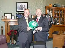 Wall described the downfall of the Progressive Conservatives as "disheartening" and the fallout, including the prison sentences, as "powerful lessons."[7] For most of the 1990s Wall's attention shifted away from politics to working in business in Swift Current. In 1991, Wall became the director of business development for the City of Swift Current, a role for which he eventually won an "Economic Developer of the Year" award.[7] At the time Wall also ran a consulting business, through which he attempted to move the Canadian Country Music Hall of Fame from Kitchener, Ontario, to Swift Current; this effort failed and the museum ultimately moved to Calgary.[2] Wall also launched a short-lived tourism business called the Last Stand Adventure Company that centered upon a "Western ranch experience."[2][9] Wall sat on a number of boards including being a founding member of the Southwest Centre for Entrepreneurial Development.