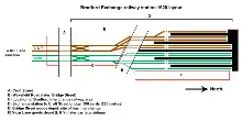 The new station was operated as two halves, with platforms 1 – 5 belonging to the L&YR at the western end, and platforms 6 – 10 operated by the GNR at the eastern end.[16][22][23] Both sides of the station had their own turntable and sidings, with the GNR side having a small goods area and warehouse.[24] This was known as Vicar Lane, with the entire GNR section being built on the former L&YR goods area.[25] The L&YR operated their own larger 5-road large warehouse on the other side of Bridge Street, which opened in 1884 before the 1888 renovations,[24][26] and retained ownership of the station completely.[27] The access and exit lines from the station mirrored the platform layouts, with two tracks at the west used by the L & Y, with two tracks at the eastern side used by the GNR.[27] Crossovers between the lines was effected at Mill Lane Junction, which is still the dividing point to this day for the lines towards Leeds and Halifax.[8]