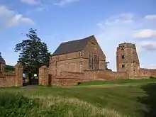Sometime after 1739 they moved out of Bradgate, which began a long decline.[3] The spectacular ruins of the house are still visible at the centre of the park.[4][5] The house was approximately 200 feet (61 m) long, featuring a main hall measuring 80 by 30 feet (24.4 m × 9.1 m). As well as considerable remains of walls and fireplaces, it has four truncated towers and the chapel is still intact,[6] containing a tomb effigy to Henry Grey, 1st Earl of Stamford and his wife.[7]