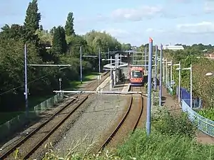 Bradley Lane tram stop is a tram stop in Bradley, Wolverhampton, England. It was opened on 31 May 1999 and is situated on Midland Metro Line 1. It is one of only a handful of Midland Metro stops to have an island platform. It is also has Park and ride facility. The site is located on the exact border of Walsall and Wolverhampton and serves the areas of Moxley and Bradley, as well as Tipton and Darlaston.