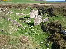 The monument is approximately 31 m (102 ft) by 17.6 m (58 ft). The entrance to the tomb is situated on the south end and directly faces the Stone of Setter.[1] The tomb was uncovered in an unrecorded excavation and robbed many years ago. What can still be seen are several pairs of upright slabs and the original back stone.[2] The monument is now covered in turf and heather. It was originally constructed of rounded stones, which is different than the typical flat slab construction of similar chambered cairns. Just beyond the monument are several large slabs, suggesting a smaller, second chamber.[2][3]