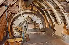 The clasp arm wooden head wheel was converted from Compass arm construction, it is 7 ft 4 in (2.24 m) diameter. The wooden tail wheel has also been similarly converted, it is 6 ft 4 in (1.93 m) diameter. The mill was originally built with a single pair of millstones, the second pair probably being added when the mill was extended at the rear.[7]