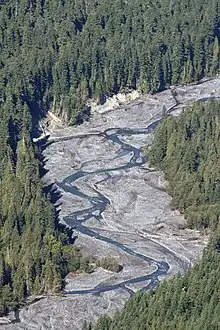 Braided rivers, as distinct from meandering rivers, occur when a threshold level of sediment load or slope is reached while a steep gradient is also maintained. On timescales long enough for the river to evolve, a sustained increase in sediment load will increase the bed slope of the river, so these two conditions may be considered synonymous; and, consequently, a variation of slope is equivalent to a variation in sediment load, provided the amount of water carried by the river is unchanged. A threshold slope was experimentally determined to be 0.016 (ft/ft) for a 0.15 cu ft/s (0.0042 m3/s) stream with poorly sorted coarse sand.[3] Any slope over this threshold created a braided stream, while any slope under the threshold created a meandering stream or – for very low slopes – a straight channel. So the main controlling factor on river development is the amount of sediment that the river carries; once a given system crosses a threshold value for sediment load, it will convert from a meandering system to a braided system. Also important to channel development is the proportion of suspended load sediment to bed load. An increase in suspended sediment allowed for the deposition of fine erosion-resistant material on the inside of a curve, which accentuated the curve and in some instances, caused a river to shift from a braided to a meandering profile.[3] The channels and braid bars are usually highly mobile, with the river layout often changing significantly during flood events.[6]