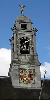 The foundation stone for the new building was laid by the local gun shop manager and council chairman, George Bartram, on 16 October 1926.[4][5] It was designed by E. Vincent Harris in the Classical style and was officially opened by the Earl of Crawford and Balcarres on 22 May 1928.[2][6] The design involved a symmetrical main frontage with five bays facing onto the Market Square; the central section featured a portico with Doric order columns supporting a balustrade with urns at the corners; there were sash windows on the first floor and, at roof level, there was a turret bearing the town's coat of arms and containing a clock made by Gillett & Johnston; it was topped with a dome and a female figure at its apex.[1]