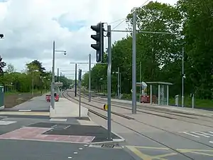 Bramcote Lane is a tram stop on the Nottingham Express Transit (NET) network, in the district of Broxtowe and suburb of Chilwell. It is situated on reserved track close to a crossing over Bramcote Lane, and has side platforms flanking the track. Trams run at frequencies that vary between 4 and 8 trams per hour, depending on the day and time of day.[1][2]