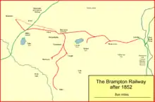 Brampton was an important township, with a population of about 3,500 at this time[15] and as a market town it received a considerable volume of goods and visitors. The horse-drawn dandy coach connection from Milton station on the main line[note 3] was increasingly criticised and goods had to be carted from Milton station, renamed Brampton in 1870.[16]