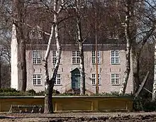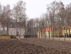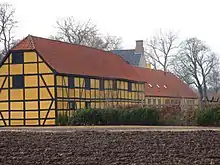 The farm buildings were originally an asymmetrical, three-winged complex of half-timbered buildings from c. 1700. Much of it was destroyed in a fire in 1930. The barn and stables were rebuilt the same year but the original closed courtyard was not reconstructed. The courtyard is to the north now defined by a residence for the estate manager, a grain storage and a gateway built with timber framing in 1854.[3]