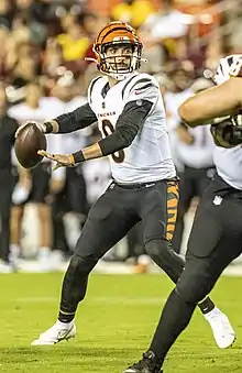 On August 1, 2020, Allen was signed by the Cincinnati Bengals.[24] He was released on September 5, 2020, and signed to the practice squad the next day.[25][26] He was promoted to the active roster on November 23, 2020, after starting quarterback Joe Burrow suffered a season-ending injury.[27] On November 25, 2020, the team announced that Allen would start for the Bengals during their Week 12 game against the New York Giants in place of the injured Joe Burrow.[28] In Week 16, against the Houston Texans, he had 371 passing yards and two touchdowns in the 37–31 victory.[29] Allen started the final game for the season against the Baltimore Ravens, where he completed six of 21 passes for 48 yards, two interceptions, and a passer rating of 0.0 as the Bengals lost 3–38.[30]