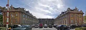 The now rococo palace was inspired by French palaces.[4] The layout was shaped like a horseshoe, with a central part corps de logis and two side wings. The building was set back from the street by a cour d'honneur, a symmetrical courtyard set apart in this way, at which the honored visitors arrived. The façades were balanced with admirable rococo decoration and rooftop windows.[4] The main entrance was decorated with a portico of four columns with sculptures on the top. The interiors were decorated in the rococo style by Johann Sigmund Deybel and Jakub Fontana. Later, a pavilion called "Buduar" was added to the south wing at the back.[5]